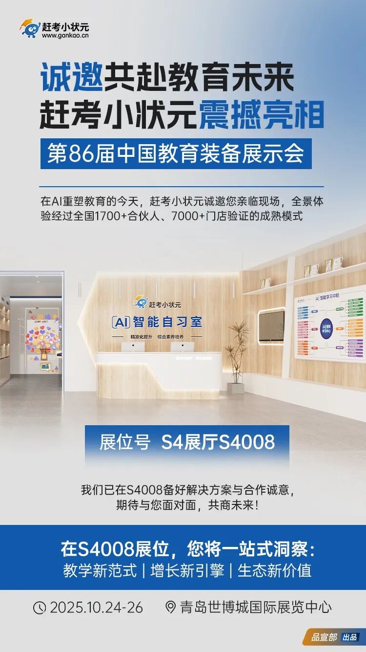 第86届中国教育装备展示会,作为全球教育装备领域的“风向标”盛会,将于2025年10月24日至26日在青岛世博城国际展览中心举行。这不仅是一次行业成果的集中展示,更是一场关于教育未来的思想碰撞。我们——赶考小状元,将在S4008展位,以一份由“1700余位合作伙伴、7000多家落地门店”共同书写的实践答卷,为您呈现一个截然不同的答案。