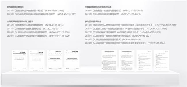 这份"基础设施"的底气,来自北科生物对行业标准化的持续深耕。2016年,北科生物联合深圳市标准技术研究院起草的《细胞制备中心建设与管理规范》(SZDB/Z 188-2016)正式发布,这是深圳首个细胞制备中心地方标准,也是我国细胞治疗产业标准化的重要里程碑。此后,北科生物又主导制定了《综合细胞库设置与管理规范》(SZDB/Z 266-2017),并参与制定了《干细胞制剂制备质量管理自律规范》《免疫细胞制剂制备质量管理自律规范》等多项行业标准。
